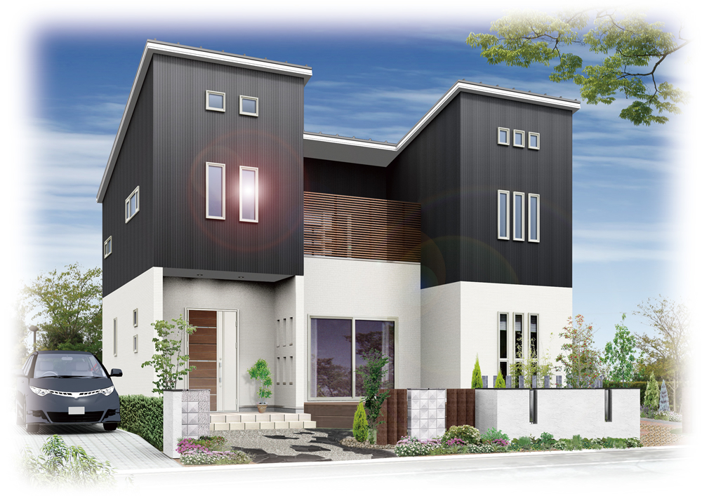 モノトーンでまとめたシャープでスタイリッシュな外観。スクエアの小窓づかいが個性を際立たせます。
