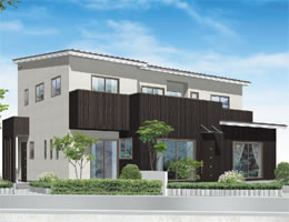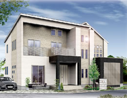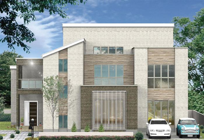 白と茶のツートンカラーとすっきりとしたフォルムで、爽やかな印象を生み出す外観。家族全員が集まる広いLDKと個々の時間も大切にできる室内空間を設けました。